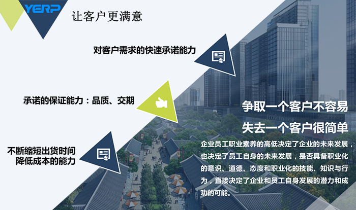 有鉴于此,YERP采取了先模拟运行,后签订合同的服务模式。客户在充分了解YERP产品功能的基础上,如果有意向,我们会派资深顾问免费上门进行调研,然后根据企业的实际业务流程和管理表单等,在系统上进行模拟呈现,客户对实际的模拟运行认可后,双方再签订合同,明确功能模块需求、实施服务方式和内容,以及合同价格和付款条件等。事先双方深入的沟通,才能防止后期发生矛盾和问题,从而让合作更愉快,并保证系统成功上线。